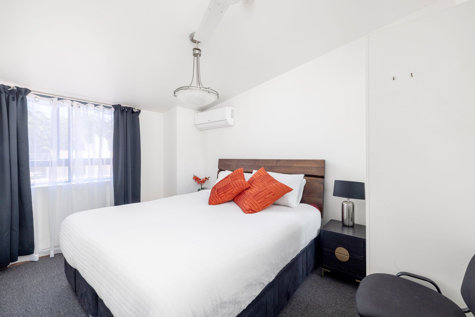 Bedroom One- One King Bed with split System Air conditioner and Ceiling Fan