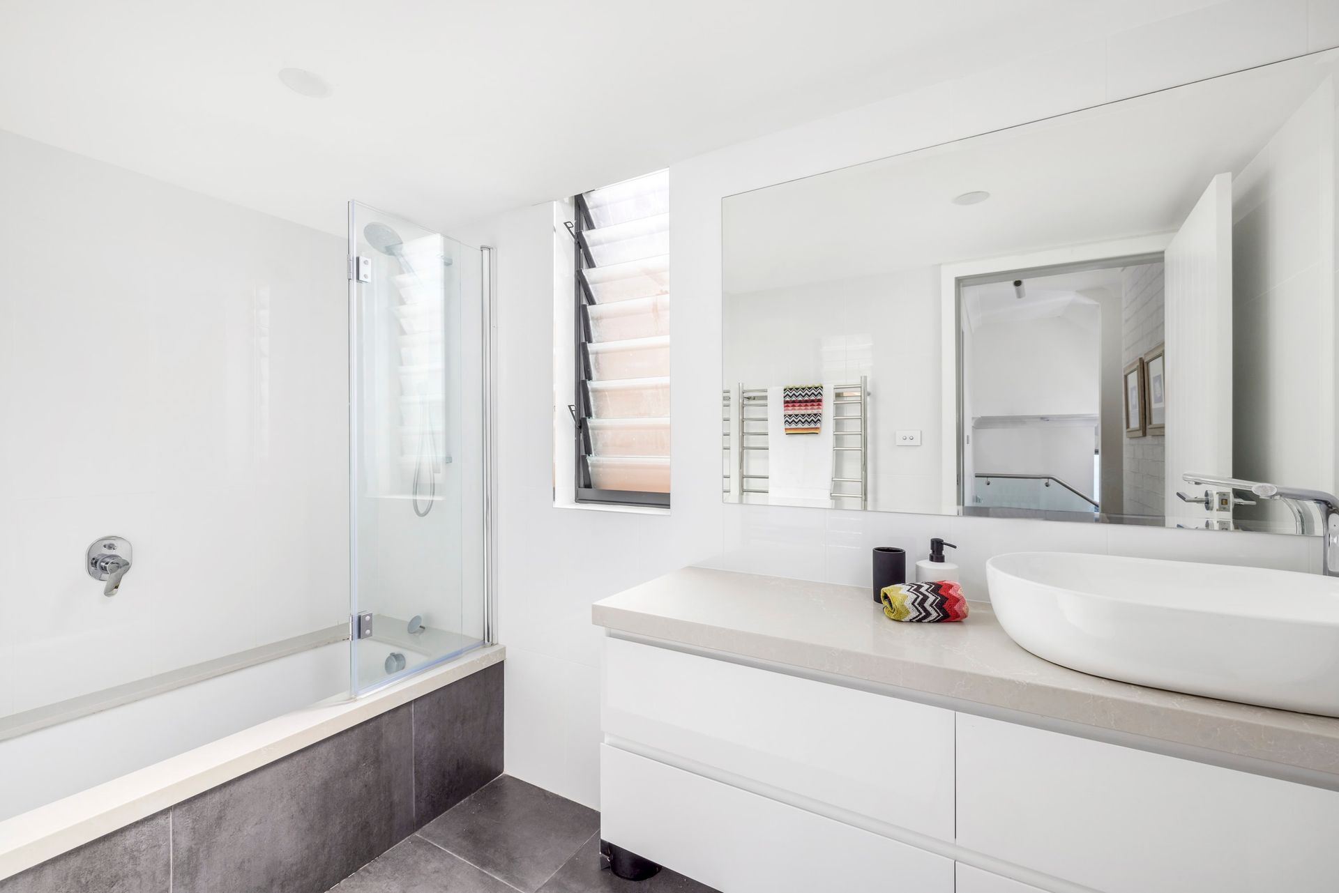 Up a couple of stairs you will find two more bedrooms, one with a queen bed and the other with twin single beds. The main bathroom with bath, shower and laundry are also on this level, the toilet is located in the laundry and the laundry has a front loader washing machine/ dryer.