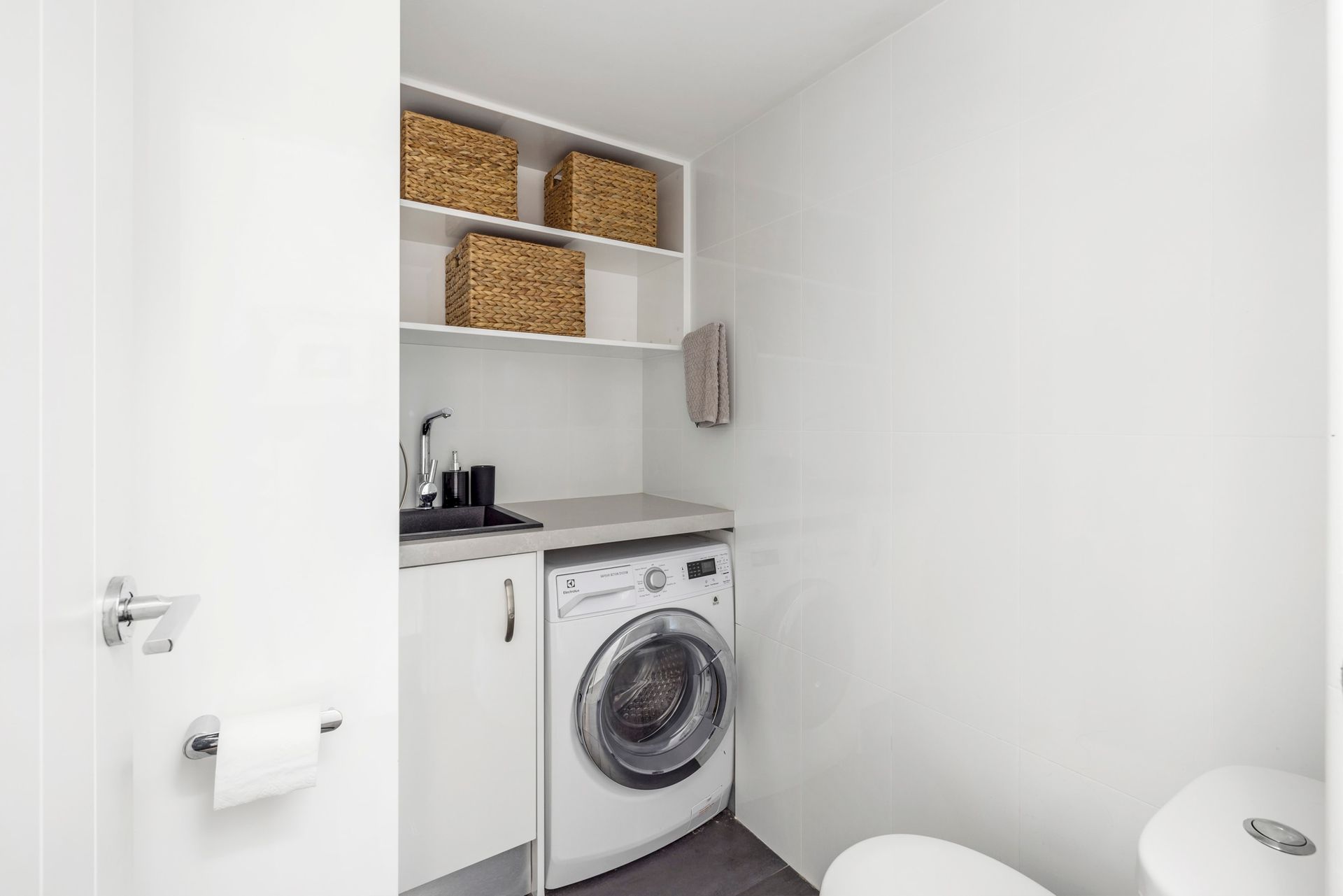 Fully equipped kitchen with dishwasher and coffee machine.